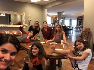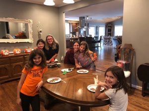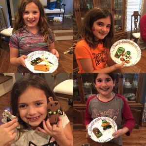 Mommy decided to back a little bit of everything into Halloween this year! Lisa, Stacy and Mimi go to Christmas Village every year and it happened to fall on Halloween so we went there that morning to get a early start on Christmas shopping. The girlies got picked up straight from the bus to get back to the house to start our Halloween celebrations. On the way to school they finally decided they wanted to carve their pumpkins so we did it Halloween day after school. Sara and Katie joined us carving another one since the one they had carved did not make it until Halloween. After we cleaned up that mess it was zombie, tombs, and coffin cookie decorating time before the girlies had to all get dressed since our friends would be arriving. Thankful for friends and family to spend the evening with, that our friends took pictures since we forgot, and for a great neighborhood to go trick or treat.