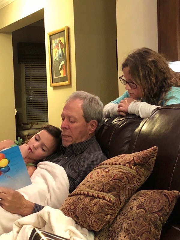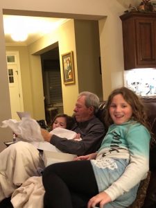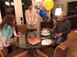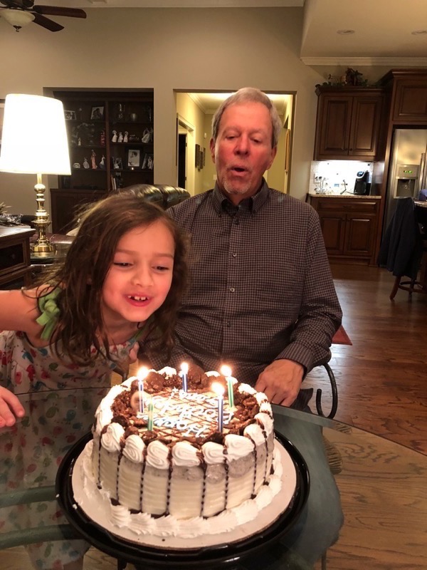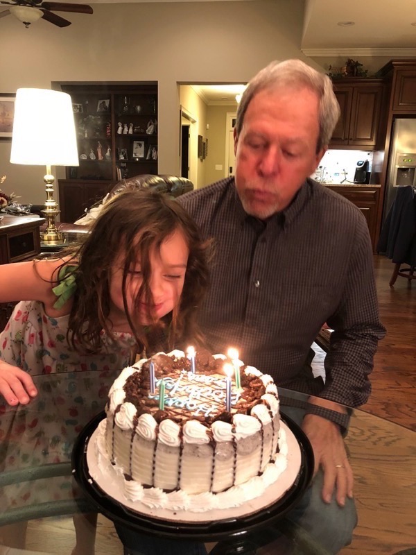 Friday, we finally got to go see Mary Poppins with mimi, Sara, Katie, and Stacy that we had been trying to go to since it came out but it had been sold out with all the rainy, wet weather we have been having over the break. All the girlies gave it a thumbs up. As soon as the movie was over we headed home to get Chris and go to Newnan to see Grandpa and Deedee for Grandpa’s 71st birthday. We met them at Longhorn for dinner then headed back to their house for icecream cake to celebrate.