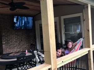 Daddy told mommy one day not to go into the office since he went shopping and bought a TV during his lunch break. She thought he was joking but turns out it was not a joke. Of course he hung it in time before football season started and he headed out of town; now we have a big TV on the porch too. Leia is loving it and staying outside on the porch more with mommy.