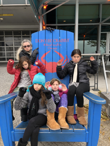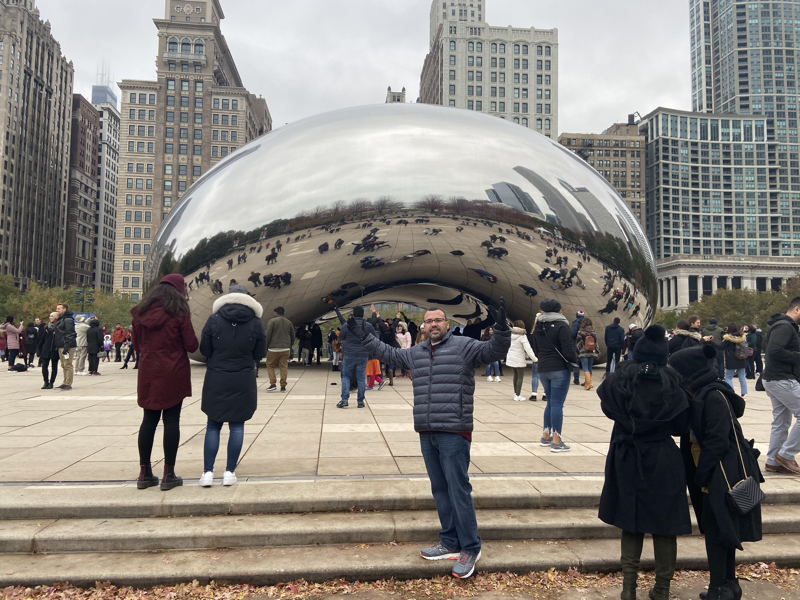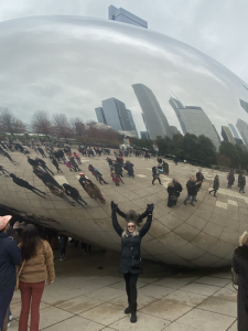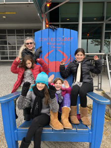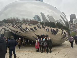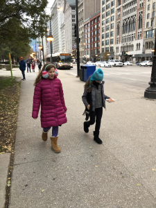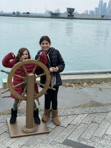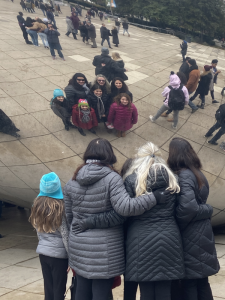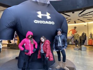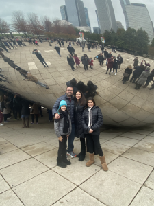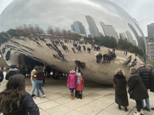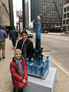 We stopped by the hotel to drop off a few items we’d bought at Navy Pier since we were passing by the hotel. Chris stayed behind to make sure our Apple account was secure since we’d gotten several fraud alerts and he’d been there a few times. The rest of us headed to see the Bean and get a photo op with one of Chicago’s landmarks. We walked around the park and saw where they were sitting up the outdoor ice rink. Unfortunately they were not opening for skating until next week so the girlies couldn’t skate but we did have fun exploring the area and thought the art work was beautiful.