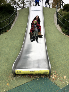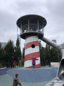 We venture to the adjacent park, Maggie C Daley. It was a incredible park! The girls had fun exploring the different areas of it. They were captains of the pirate ship. They climbed up up towers and got to slide down almost a dozen different slides. Even the adults got on a couple of the smaller slides to join in on the fun. Stacy and Mark left to go get our names in a wait list for dinner while the rest of the adults let the kids enjoy the park as long as possible.