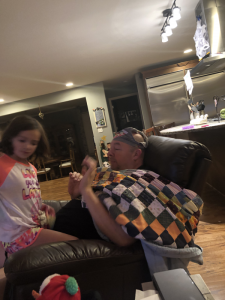 Leia got some energy so joined her torturing daddy while mommy laughed then Leia decided she was all better so should put on footy PJs even though she felt like a hot box with a fever.