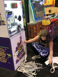 Leia chose to pick up lunch at Zaxbys to go home to eat and watch one 30 minute show before heading to Chuck-e-Cheese. We each got a 45 minute card to play together. It was fun that we were the only two playing. We played side by side for more of our time. Even when we didn’t we were talking to each other. It was so much fun and special to get some one on one time together. We won almost 3,000 tickets and Leia elected to get a finger monkey to remember our time together instead of saving them. We called Mimi on our way home to see if she wanted to meet us at our house.