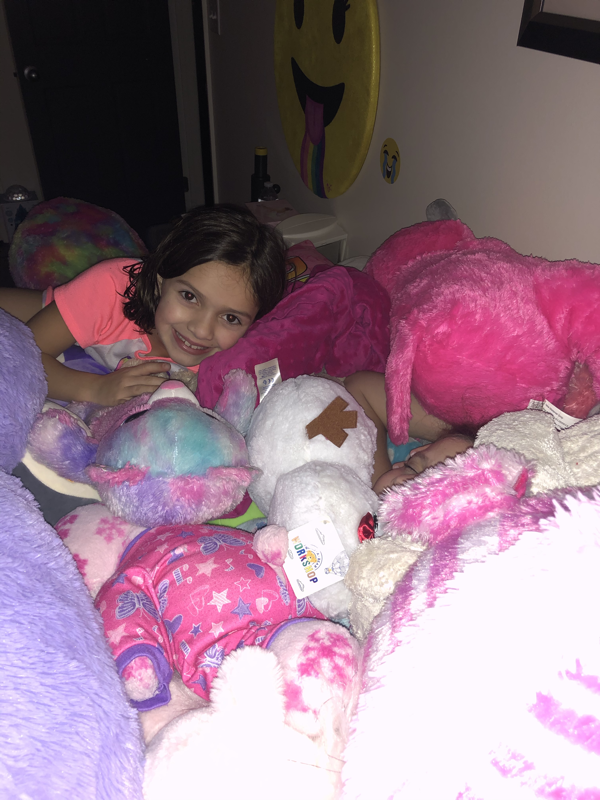 Last picture of the night our littles chilled out and bedtime …. it is hard to find one child in the bed with all the stuffed animals