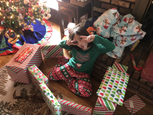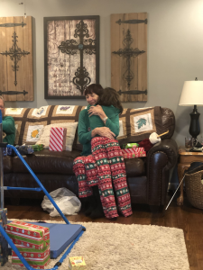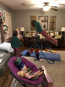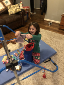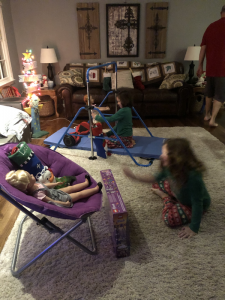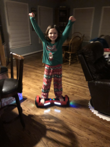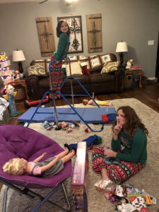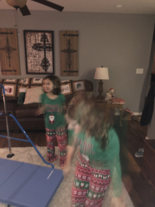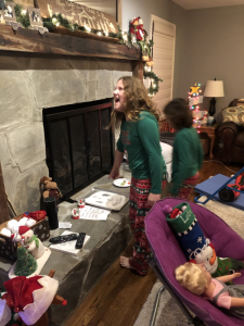 The sweet girls were up at 5:30 ready to see what Santa brought. Mommy held them off from waking daddy a few minutes but then thought, nah let’s wake him; the girls were excited and wanted to see what Santa brought. So we were out in the den seeing the goodies from Santa a few minutes before 6. We loved watching their sweet faces get excited looking through their stockings, flipping over the gymnastics bar, tearing into the legos, riding the Hoover board, and enjoying their sweet life. Once the girls were enjoying their toys mommy and daddy made a cup of coffee to sit back and take in a few minutes of the pure joy; it was nice not hurrying and having a few minutes to chill watching the girls enjoy their new toys.