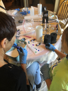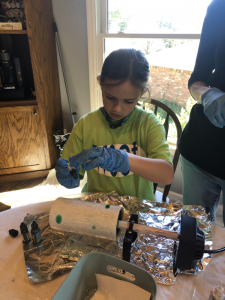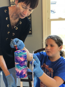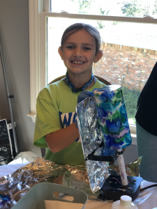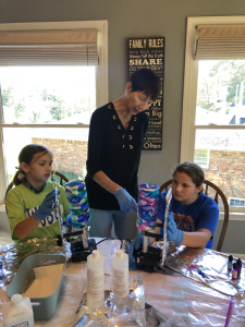 Darrel had set up a craft while we were at the meeting for the girls too. They got to paint vases with alcohol paints. Deedee brought tons of colors to chose and the colors each little lady picked was exactly the colors we expected. They listed carefully and followed her directions. Neither of them wanted to keep the gloves on any longer than they had too so as soon as they finished the fun part the gloves came off and they skipped the clean up. The vases turned out beautiful!