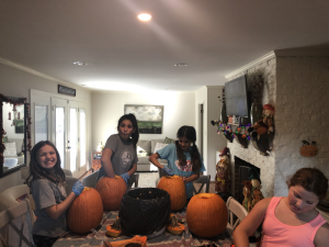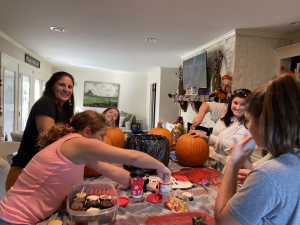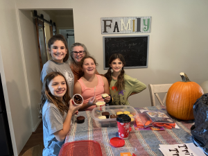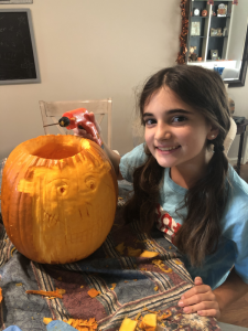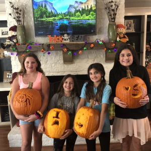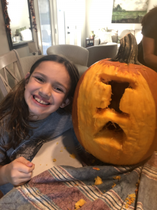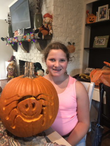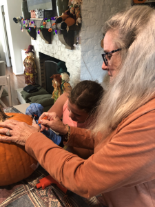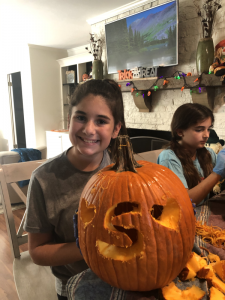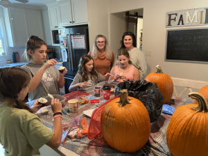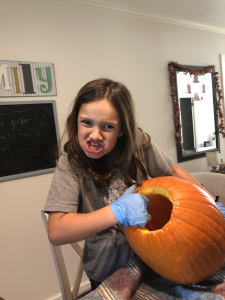 We arrived at the Rhoads before Sara and Katie got out of school so the girls carefully picked out their pumpkin and our eldest cleaned her’s too while we we waited. Before the girls touched the pumpkin guts they opted to decorate the cupcakes Mimi baked. As we watched them decorate the cupcakes and start carving their pumpkins not needing very much help we thought about how much our girls have grown and reminisced how they use to paint the pumpkins because they were too little to carve. Time marches on and now they are all carving their own. Next year we may have to get everyone a pumpkin to carve.