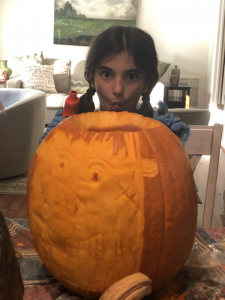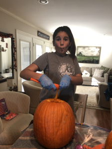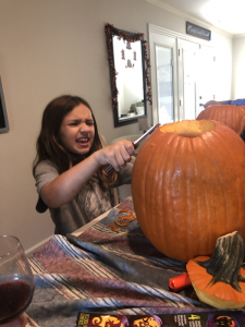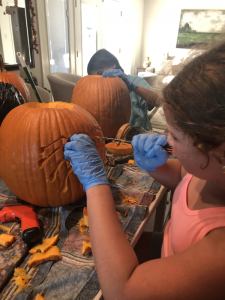 Mommy and aunt Stacy cut the tops off the pumpkin and mommy cleaned the guts out of Leia’s