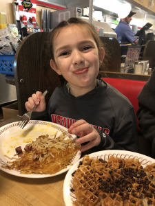 Saturday, morning sweet Mimi brought the girls back home at 7 so Chris could take them to a private horseback lesson. Mimi and Lisa walked and visited then we all chilled until Ivy’s basketball game at noon. They played awesome! The team won the first game with a runaway. We had a short break between and the second game was only won by 3 points but Ivy played most of the second game and had a great attitude so she got to pick anything she wanted for dinner, we should have known she would pick Waffle House.