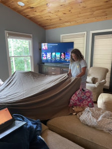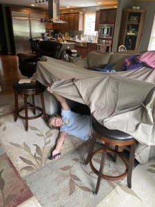 Friday morning, it was storming when we woke up so the girls skipped swim and dive again since there was no drop off and neither mom or dad could sit up there just to see if the pool would open. Thankful mom was feeling a little better but still decided to have a chill day after running to Walmart and picking the girlies up breakfast. The girls hung out in the tent that Leia built on Wednesday and played down stairs most the day. That afternoon, mom finally broke down to go to the doctor after almost three days of no energy to get a shot and medicine so we could enjoy the 4th of July weekend with family and friends. That evening, Chris and the girls headed down to the Talley’s for game night but had to have an early return for an early horse back lesson the next morning.