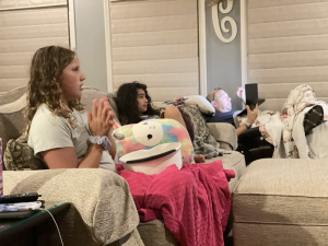 Friday morning the girls and momma made sure all the sheets were washed and chilled out for the morning waiting on aunt Joy and Raina to arrive. They got her early afternoon and we relaxed a few minutes while we waited on Chris to finish up working. We headed to Mimi’s house to grill out and let the girls swim for the evening. It was a great visit. After the girls were water logged we headed back home for a movie night watching, “Yes, Day” and waited on Dan, Nancy, and Reid to arrive too. Traffic was bad so they did not arrive until 10:30ish but we were able to visit a half a hour before everyone headed to bed.