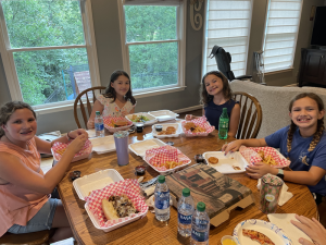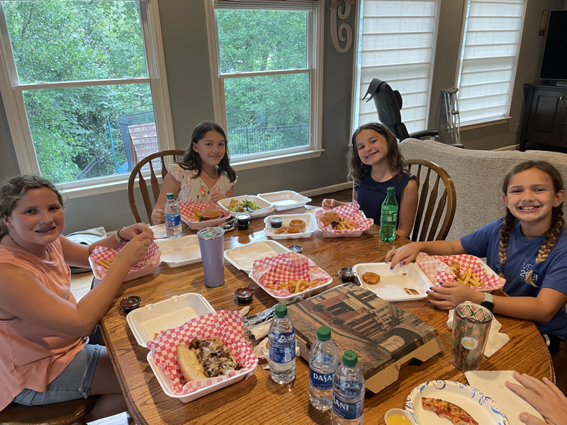 Wednesday, Gene got up early to drive to Columbus, GA to trade in Darrel’s pilot for a new Palisade. He got back right as Lisa and Chris both finished up a work call so we all went out to see the new car. It is pretty and has all the bells and whistles on it. Chris drove it around the neighborhood so we all got to ride then Darrell drove it around too before she and Gene headed to pick up Ivy and Leia. They also picked up our neighbor, AlexAnn as well then took the 3 of them to get ice-cream while Lisa and Chris continued working. It was the first day since Lisa got Covid she felt like she could focus and work all day. We played clean out the fridge for dinner and grilled burgers so Leia had one to take for lunch the next day. It was a good day!
