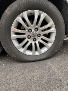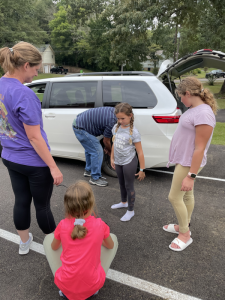 On the way home we saw the tire pressure light come on so momma got to figure out where the tire is located on a van (lesson learned it is in the middle) and started changing the tire. A sweet man at the church we pulled into came over to help us after we had pulled the tire out and started jacking it up
