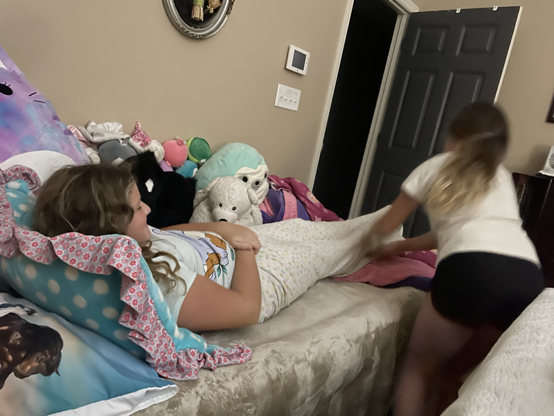 Little sis tucking in big sis Tuesday evening…not sure if she did it to delay going to her room but it seemed about right