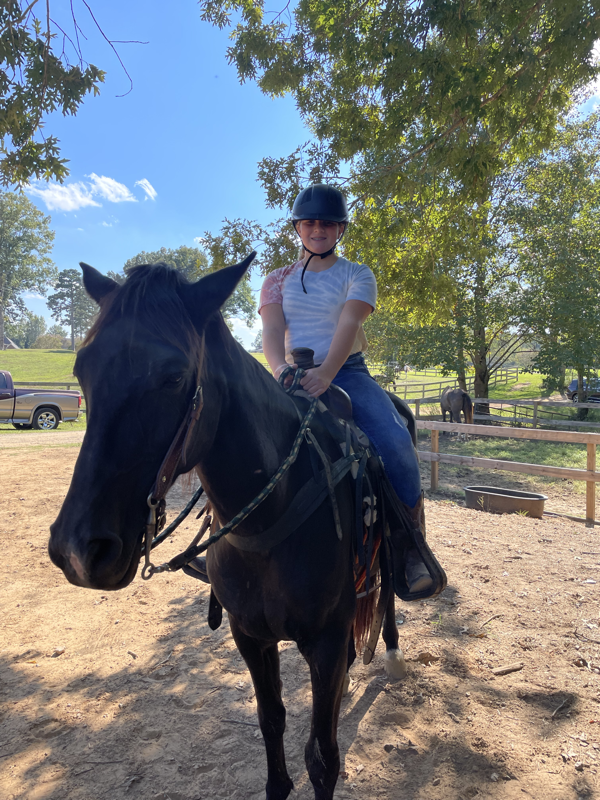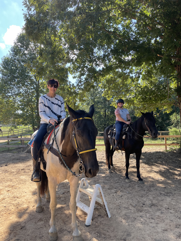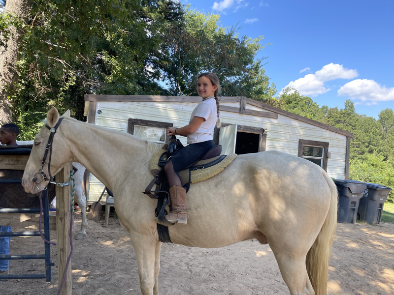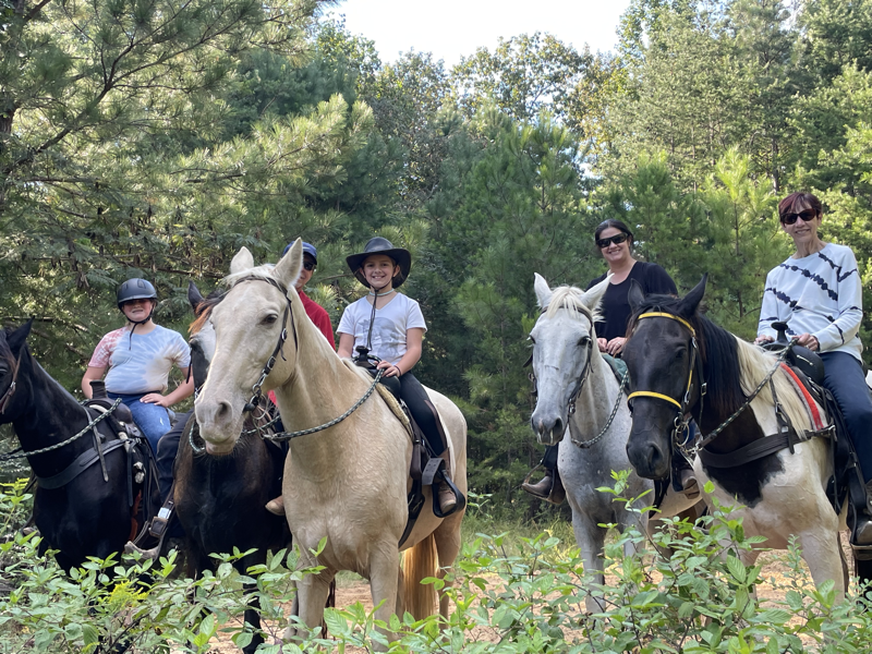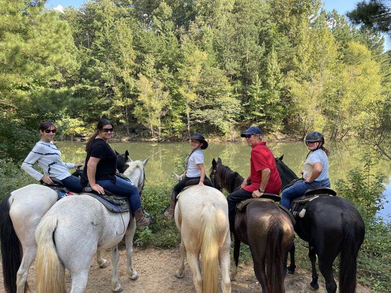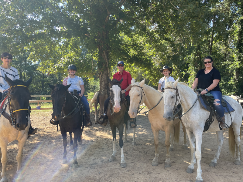 Sunday morning Grandpa and Deedee took Ivy on a breakfast date to Waffle House while Lisa picked up McDonalds for Leia; both girlies got what they wanted. We all hung around the house all morning. The Ryders Cup was on TV for Chris, Gene, and Darrell. The girls entertained themselves downstairs and Lisa worked in the yard a little. That afternoon we headed to Gardendale to take the girls to Mo’s Carriage Ride to ride horses. Chris hung out with Mimi at her house but the other 5 of us headed to the trail. We all got mounted up to head out for some fun. It was a great ride. Only mishap was that Deedee and Lisa’s horses were not friends so when Patch tried to kick Jaguar and ended up missing to kick Lisa’s leg. The horse was strong and ended up giving a bruised bone and small cut, nothing a little ice and neosporin did not fix. We enjoyed a yummy dinner at Mimi’s and finished one of the ball games on TV before heading home to chill out for the evening.