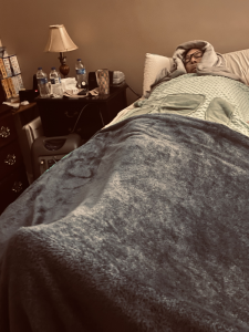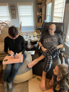 Monday evening, Mimi and the Rhoads came over for dinner. Chris had said he was going to lay down as the smell of the food was getting to him. Lisa walked out to eat with everyone. As we were close to finishing dinner the phone rang and said “hubby”. She immediately started walking to the bedroom as Chris did not sound right. Upon entering the room there was cold sweat, the ned was soaked, Chris was saying he did not feel right, slurring words, and then his eyes rolled back in his head. Lisa’s heart was racing! As she remembered Stacy was in the den she yelled and her sister came running. It was a chemo reaction but neither Chris nor Lisa knew what to expect with the reactions. We got cold clothes to wipe Chris down and cool him down. Stacy continued talking calmly to him and getting him to drink water as Lisa went to make a protein shake for him. He drank the first shake and then a second. As he started re-hydrating he started talking more normal and freezing. Lisa convinced him to stand up while Stacy and Mimi striped the bed to put on new sheets. When he was back in the dry, clean bed we wrapped him in blankets to warm back up as he drifted off to sleep. Lisa was still nervous. Stacy massage her sisters feet with oils and soothed her fears letting her know it was a normal side effect. Dr Willey texted too confirming the same thing. That night Mimi and Stacy stayed at our house just in case to help ease Lisa’s mind.