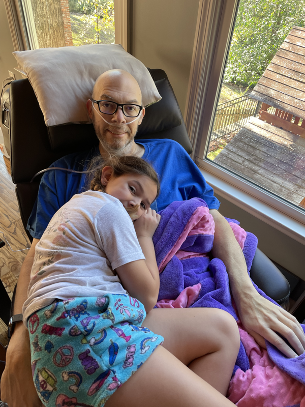 Wednesday, Kelly came to town. It was sweet to see her. Lisa was still in a fog so there are not many pictures but that evening the sweet night snuggles with daddy’s baby girl was snapped and chris reaching out just to hold my leg was captured. We still are holding each other for dear life; God please heal Chris!