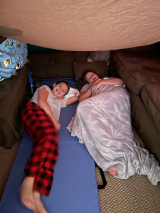 Sunday was beautiful day! Chris, Gene, and uncle Mark enjoyed Sunday football. Mimi, Deedee, Lisa, and uncle John took the girls to StarLake to ride bikes. It was the first time in a while Lisa got to walk more than a mile. Thank you God for blessing us with the time and health to enjoy the day. The girlies built an amazing fort in the basement to hide out in when they needed to escape.