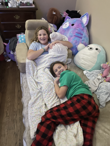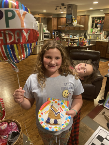 Present time was on Leia’s agenda next. She always is so sweet in letting Ivy help her open them. This year she got horse earrings, chess game, checker game, sleep mask, and money for her Kendra Scott jewelry she wanted to pick out that day. We gave the girls a choice on weather or not they wanted to go to school today. Leia opted to spend her whole birthday at home while Ivy opted to go to school since she had a field trip. Ivy hitched a ride with the neighbor while momma and Leia snuggled up on the couch watching Hallmark as daddy napped on and off.