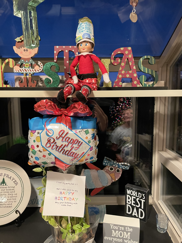 Leia woke up multiple times throughout the night. About 5:30 momma saw her up and said happy birthday then she climbed in the bed to snuggle and we snapped the first picture of the day. Daddy woke up a few minutes later telling her happy birthday too but he would not let us post the morning picture of him. Ivy heard us all talking and woke up a few minutes later. The girls headed to the den to see what our elf, Cupcake had done since she normally has her birthday clothes on ready to celebrate.