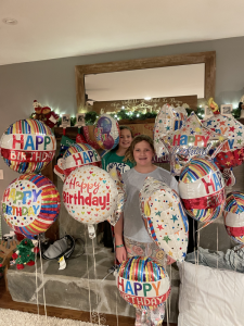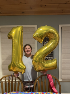 The birthday girl had 12 balloons on the white rug; of course we had to get a picture with them all
