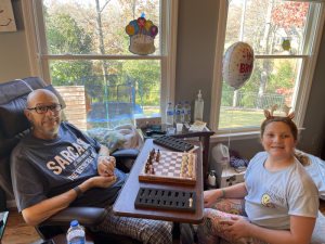 Mimi called after she dropped off Sara and Katie at school; she was keeping them since Stacy and Mark went to Ross Bridge hotel for their anniversary. Mimi asked if anyone wanted her to pick up breakfast. Surprisingly Chris wanted something so she brought it by and Leia opened one of her presents. When daddy woke up, we asked him to play Leia in a game of chess. She loved it! He is a great teacher. As they were playing VHEW counselor called Lisa and we determined Ivy should come home for the day too. Mimi picked her up then we had sweet family time the rest of the morning.